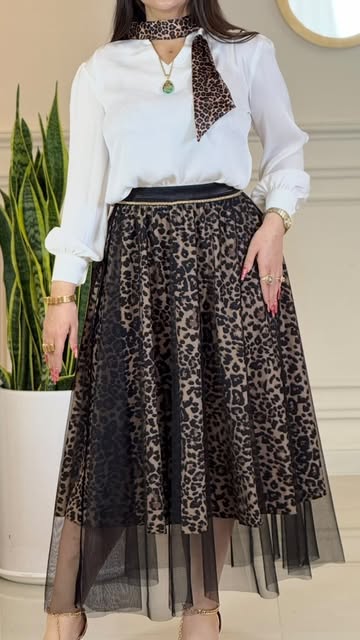 ست شومیز سفید و دامن پلنگی با تور مشکی